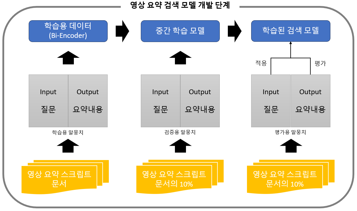 영상요약 텍스트 기반 검색 엔진 학습을 위해 검증용 말뭉치와 시험용 말뭉치를 전체 말뭉치의 10%로 제시한다.하이라이트 요약 텍스트 검색 모델학습 학습 검증 시험 개요 영상 스크립트 요약 내용 학습 시 모델 성과 평가 및 비교 모델 학습 완료 후 테스트 F1-score 필요문장 80% 10% 10%