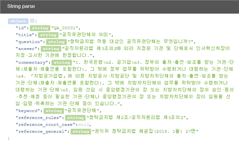 경우, null 값 허용3 jdgmnInfo Object Y Q&A 3.1 question String Y 질문 불가 3.2 answer String Y 답변 불가 답변 유형: 긍정, 부정, 불명 4 Summary Object Y 요약 라벨링 4.1 summ_contxt String Y 요약대상원문 불가 판결 요지 등 판결문의 주요