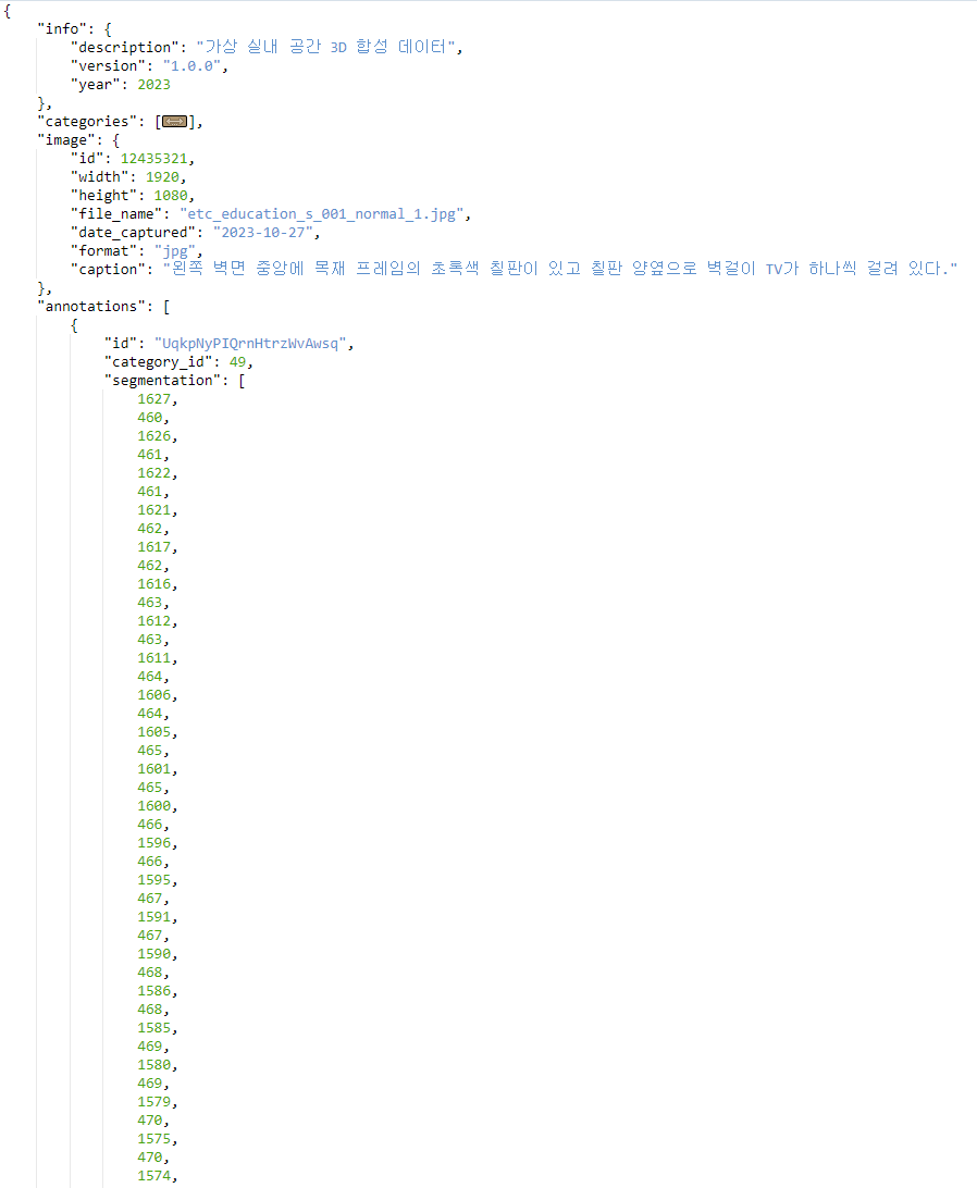 여부설명 1 info object 데이터셋 정보 1-1 description string Y 데이터셋 명칭 1-2 version string Y 데이터셋 버전 1-3 year number Y 데이터셋 생성년도 2 categories array 카테고리 정보 2-1 id string Y 카테고리 아이디 2-2 name string Y 카테고리 이름 2-3 type string N 에셋 데이터 타입 3 image object 이미지 정보 3-1 id number Y 이미지 아이디 3-2 width number Y 이미지 너비 3-3 height number Y 이미지 높이 3-4 file_name string Y 이미지 파일명 3-5 date_captured string Y 이미지 생성일 3-6 format string Y 이미지 확장자 3-7 caption string Y 이미지 설명문 4 annotations array 어노테이션 정보 4-1 id string Y 어노테이션 아이디 4-2 category_id number Y 카테고리 아이디 4-3 segmentation array